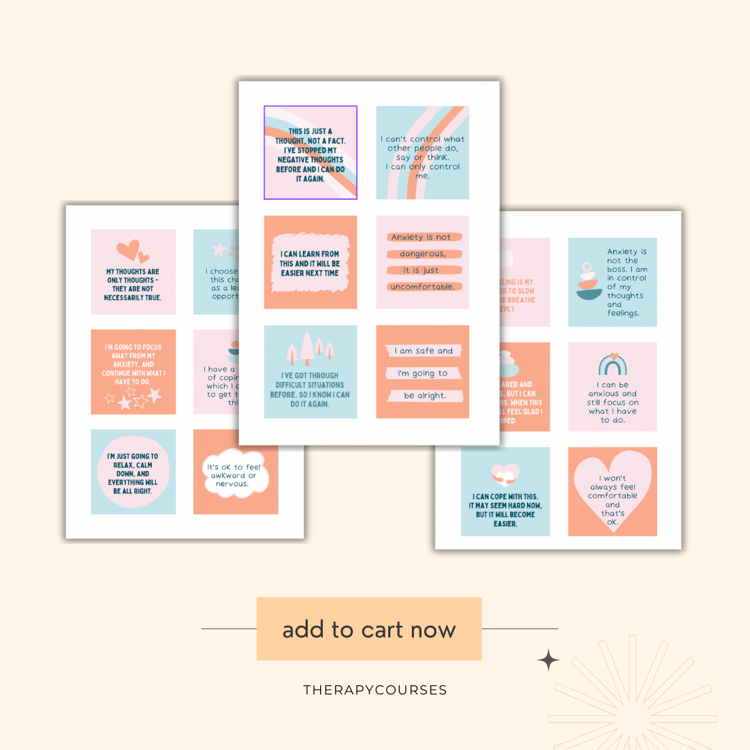 The product contains 5 pages (32 cards) of anxiety coping statement cards that can be printed and cut out. These anxiety/worry coping cards pdf are print-ready and you get instant access upon checkout.