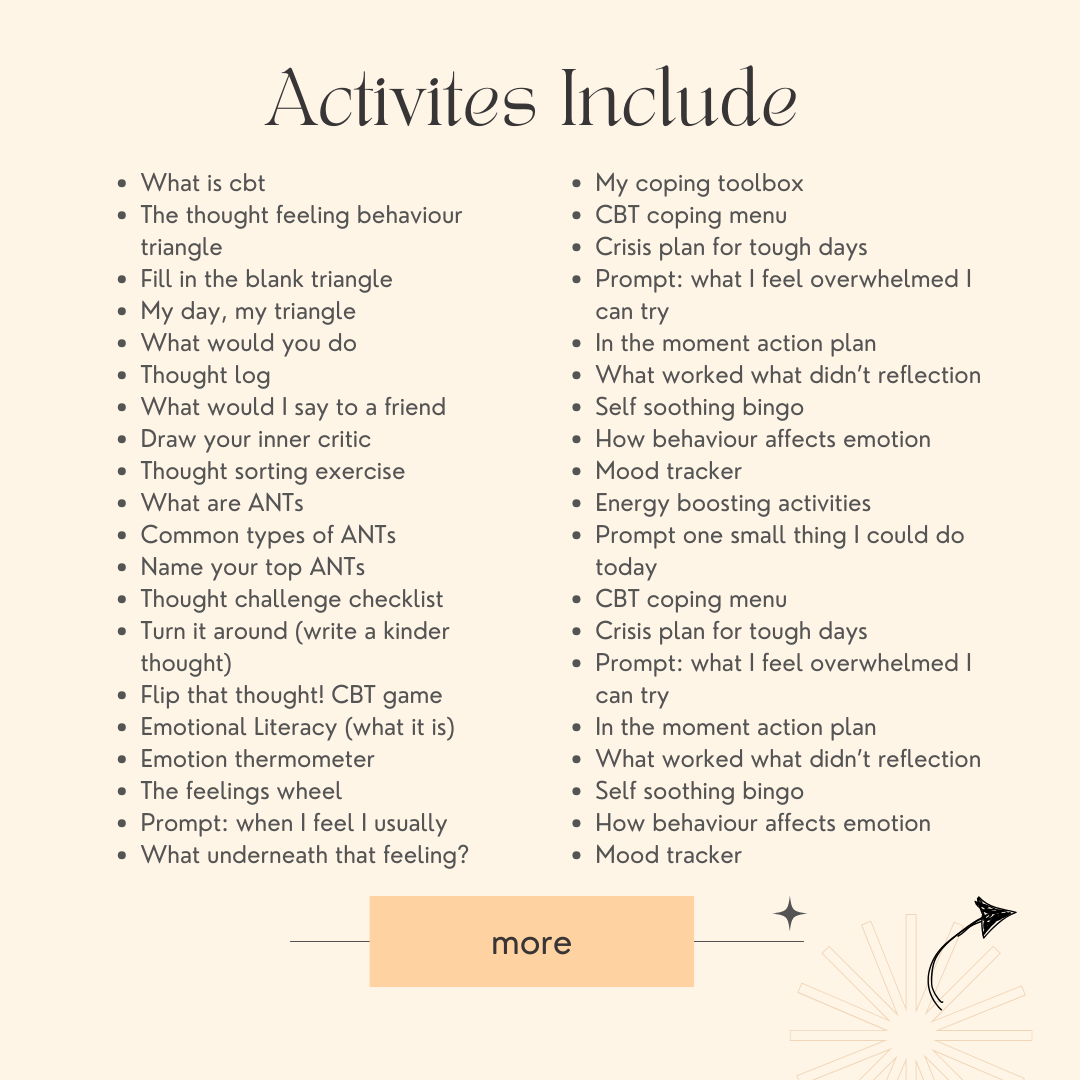 Over 50+ evidence-based CBT worksheets (see pictures for full list), covering topics such as: