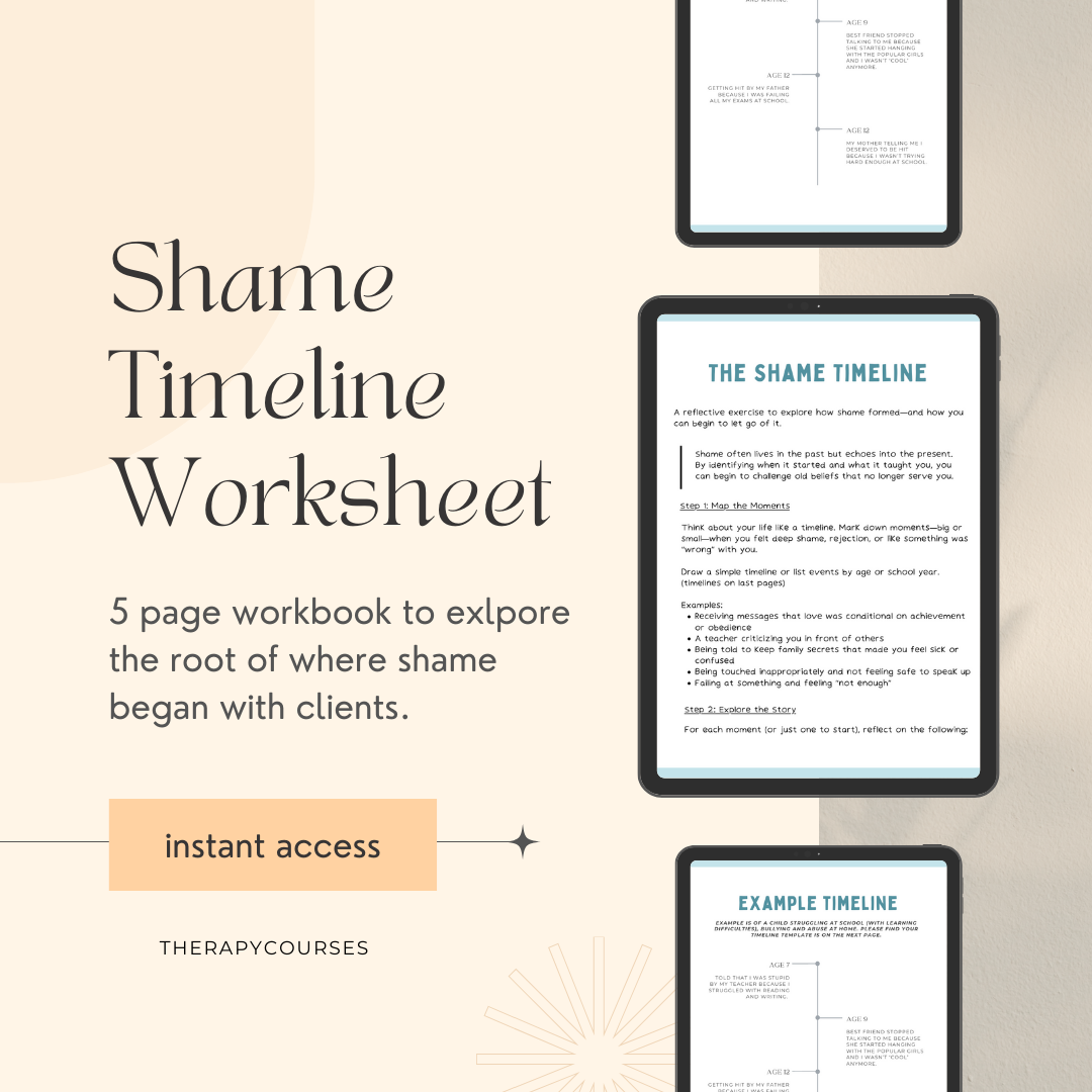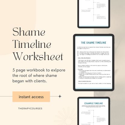 The Shame Timeline Worksheet is a gentle, guided worksheet designed to help clients explore when and where shame-based beliefs first took root—and how those beliefs may still be shaping their self-perception today.